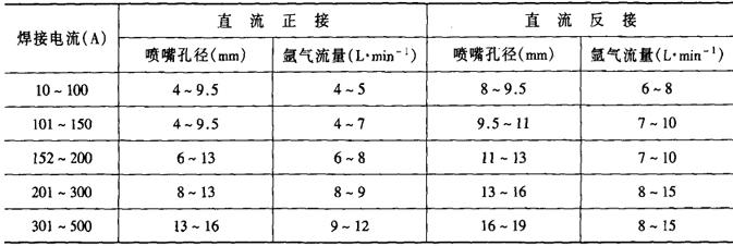 5.喷嘴孔径及氩气流量 喷嘴孔径越大,保护区越大,但太大时,熔池及电弧的可观察性变差。对于一定的喷嘴孔径,保护气流量有一个合适的范围,流量太小时,气体挺度差,保护效果不好;流量太大时,气流层中出现紊流,空气易卷入,保护效果也不好。喷嘴孔径及氩气流量通常根据电流的种类、极性及大小来选择,如表1-6-30所示。 表1-6-30 喷嘴孔径及氩气流量的选择[3]