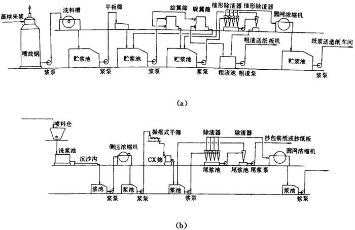 漂白麦草浆,用碱量受麦草质量的影响,新麦草比陈麦草增加1%的用碱量(NaOH)。 由于漂白麦草浆生产的纸张品种不同生产中普遍采用球外预浸渍及快速蒸煮法,即延长升温时间,缩短保温时间,有些厂取消保温时间。 常用的几种蒸煮曲线: ①延长升温,不保温; ②缓升温,短保温; ③短升温,长保温。 注:③曲线用于生产硬度低易漂白的稻麦草浆,生产比较高档次的薄页纸用。 (4)操作要点 ①蒸煮用的各类化学品,必须专人负责,并且做好收入支付记录,交接班时要验收核实。 ②化学品按工艺条件放入到白液桶溶解或稀释后,方可进行加温,温度必须控制在90℃以上。 ③装料时若无预浸设备,开始装料后约10min徐徐将化学品加入到球内,同时缓缓进汽。若有预浸渍设备,切料后草料由运输带送入螺旋预浸设备时,同时开始徐徐加入化好的蒸煮白液,两者操作时必须保证草料与白液同时装完。 ④装料完毕后必须清扫地面上的散草片,同时装到球内,防止落到楼下。 ⑤球盖螺栓必需对面二边换次旋紧,防止单面松紧。 ⑥进汽前与动力锅炉车间联系,得到同意后,徐徐进汽。按工艺技术条件控制。 ⑦蒸煮完毕,停下蒸球,若是倒料,卸盖向下,先进行放汽到压力为零。然后蒸球的铆盖向上,准备开铆盖,开后倒料。若是喷料,锅口部向上,接好喷料管,全压喷料,若为轴头喷料,打开喷料阀门由小徐徐开大。 ⑧倒料或喷料后,倘未接着装料,球口必须向下,待下次装料时转正球口。 ⑨蒸球中心轴有蒸汽强化管时,每次喷料或倒料后,稍开蒸汽,清除强化管的缝隙阻止堵塞,每隔3月检查1次,用锯条清理缝隙。强化器管上缝隙必须保持畅通,以免影响蒸煮后草浆料质量。 3.洗涤筛选工艺流程技术条件与操作要点 (1)洗涤筛选工序工艺流程 ①草浆最简单的洗涤筛选工艺流程(图5-3-7a和b)。