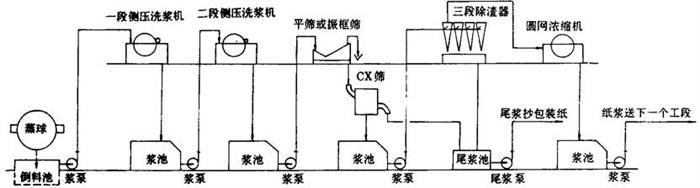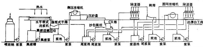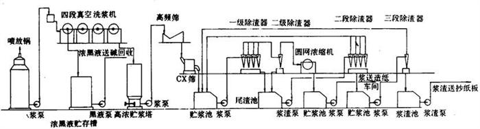 图5-3-7 草浆最简单洗涤筛选工艺流程 ②真空洗浆机提取麦草浆黑液与洗涤筛选工艺流程(图5-3-8)。