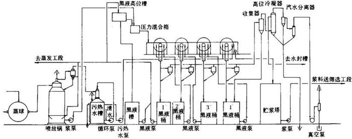 图5-3-10 稻草浆洗涤工艺流程 ⑤真空洗涤浆机提取黑液工艺流程(图5-3-11)。