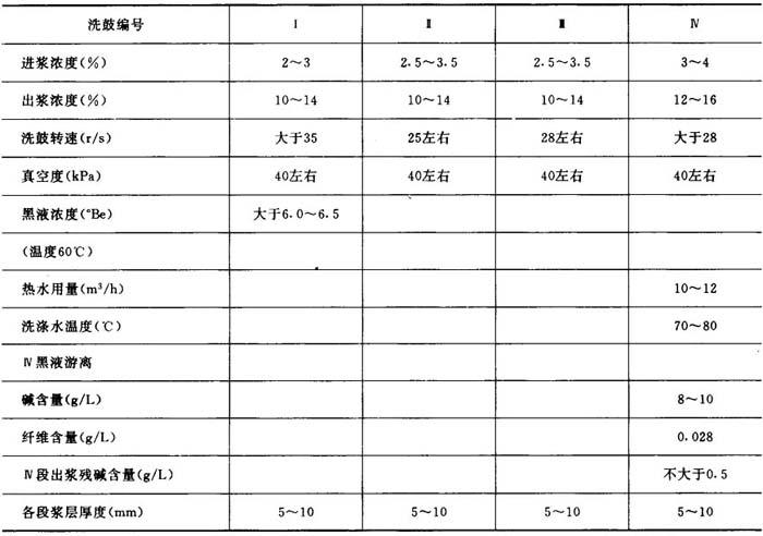 图5-3-11 真空洗浆机提取麦草浆黑液工艺流程 (2)洗涤筛选工艺技术条件 ①球下池假底洗涤浆料 梅花眼孔径:3~10mm; 滤网网目:40目(聚酯网或尼龙网); 假底坡度:3~5%; 假底距真底高度:0.5m左右。 ②平板振框筛 进口浓度(%):0.7~1.0; ③侧压式浓缩机 网目:40~50目(聚酯网或尼龙网); 生产能力:1.5~2.5t/d·m2; 进浆浓度:2~4%; 出浆浓度:7~12%; 白水浓度:0.025~0.04%。 ④真空洗浆机四段逆流洗涤筛选技术条件(表5-3-3)。 表5-3-3 真空洗浆机洗涤工艺条件