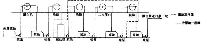 ⑥水平带式洗浆机洗涤、筛选工艺技术条件 进浆浓度(%):2~3.5; 出浆浓度(%):10~13; 总表真空度(MPa):0.04; 各段分表真空度(MPa):0.02~0.03; 浆层厚度(mm):3~5; 车速(m/min):20~25; 逆流洗涤:4~6段; 洗涤水温度(℃):70~80; 低压冲水管水压(MPa):0.2~0.3; 高压冲水管水压(MPa):1.2~1.8; 喷水量(L/s):1.2~1.4; 稀释因子:1~3t水/t浆。 (3)操作要点 ①蒸煮放料操作要点 a.用假底球下池初步洗涤时,每次放料前,先检查滤网是否破损,对于破损及结垢影响滤水的滤网应及时更换。 b.用喷放放料时,喷放锅空锅不能喷放,空锅喷放前应向喷放锅内加点黑液,并经过搅拌后,才能喷放。 c.喷放锅底部浆浓必须控制在2.0~2.5%时,才能送料。 d.推进器不运转时,不许喷放,也不准送浆。 e.黑液桶内必须有一定黑液的贮存量,以保证开车时真空系统运转正常。 f.黑液送碱回收,每次供应时必须取样测定浓度与温度,并计量,黑液的质量应符合工艺规定的质量指标。 g.喷放锅中贮存的浆料不宜过多,时间不宜过长,否则会给送浆带来一定的困难,使送浆浓度不易掌握。 ②真空洗浆机操作要点 a.多台真空洗浆机串联使用中,常装有旁通管,当其中一台发生故障时,浆料可由进浆槽或稀释槽操作侧的旁通管绕过,进入另一台洗浆机的稀释搅拌槽,并在停用鼓槽的进浆侧用木板拦截浆流,以提高浆位,继续生产。 b.掌握好洗鼓的转速与进浆浓度的关系操作要领:“低浆位,高真空、慢转速、均匀上浆”。开车时要采用高浆位、低浆浓上网,上网后立即降低浆位,(控制在网槽的1/3~2/3处)并提高浆浓至规定范围。 c.网应一段一段地上,并以第二段为主,由此段决定前后各段的情况,否则容易产生糊网,堆浆、落网等现象延长上网时间。 d.开车上网在提高Ⅲ-Ⅳ段中间槽浆位时,要防止黑液满出至Ⅳ段网槽,因为黑液流入出浆槽,就会增加粗浆中残碱含量。 e.各段洗浆机的淋洗液不要喷得过猛,应喷得均匀全面。同时也不得将淋洗液关闭,特别禁止长时间关闭。 f.经常检查洗后浆料的质量,黑液温度、浓度及黑液桶液位,并根据情况进行调节,使之适合工艺条件的要求。 g.在停车时,应先关中间槽黑液阀,再停黑液泵,以免洗鼓冲网管堵塞,影响洗网效果。 h.各段洗浆机分配头子上的机油杯,牛油杯决不能断油,否则咬煞就会造成水腿翻掉影响生产。 i.为了提高黑液质量,保证碱回收生产需要,不得将各段黑液桶之间的阀门随便开通。 j.处理黑液槽堆浆应用本段黑液冲散,并且经常检查喷放锅及粗浆池的满浅。 k.蝶形阀在正常生产中一般不调节,在运转中如发现洗鼓进浆边有黑液倒灌现象时应开大过滤区的蝶形阀,同时应调整洗涤区的蝶形阀,当浆层堆以剥落时,应关小洗涤区蝶形阀,以降低真空度或从分配阀剥料区通压缩空气吹浆层剥落。 ③水平带式洗浆机操作要点 a.滤网使用时间久了,排污管道结垢堵塞,排水不畅,应定期清除管垢,保持黑液排出畅通。 b.网边带浆,使真空度被破坏,洗涤效果下降,发现带浆,立即清除,二网边加空边装置并清浆。 c.滤带打滑,须加强滤带的清洗 各洗涤设备的滤网和筛选设备筛板,经常清理洗刷,防止堵塞、糊网和结垢,出现破损应立即修补或更换。 洗涤与筛选过程严格工艺条件,在保证洗涤效果下,节约用水,充分利用白水。在保证筛选效率下,减少排渣量,控制纤维流失。 严格控制各筛选设备的进出口浓度,压力,浆流量,各类浆池及渣浆池必须保持一定的液位。 各种筛选及洗涤设备停机前必须清洗,防止浆料及渣浆停留在设备及管路中造成堵塞。 4.漂白工序工艺流程、技术条件与操作要点 (1)漂白工艺流程