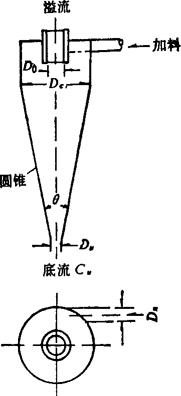 图4-3-38 水力旋流器示意图 1.水力旋流器的分离效率 受两个不同特性的变量支配:一是从溢流中除去的最小粒径,即所谓“切割点”;二是底流中固体产品,经常以所占料液固体量的百分数表示。工业上常用下式计算旋流器的分离效率(即d50法)