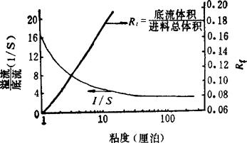 图4-3-39 粘度对料液分配与流量比的影响 3.旋流器的设计 (1)应用d50法,根据所分离的石盐粒度,先定一个d50的数值,然后再代入所需要的数据,由式(4-3-30)求取能满足一定处理量Qf所需的旋流器直径Dc,再按以下比例求取其他各部的几何尺寸: