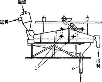 式中 K″由实验测定 Go——溢流(顶流)流量(m3/min) 由Dc可按d50法初选其他各部的尺寸,然后由式(4-3-32)或(4-3-33)验证增稠比,达到预期要求后即可决定。由式(4-3-31)、(4-3-33)计算出其压降,供选泵时用。 (二)振动筛分级脱水 1.分级脱水过程及筛子结构 经水力旋流器初步分离、浓缩后的石盐浆体,由底流口直接进入振动筛(如图4-3-40)。
