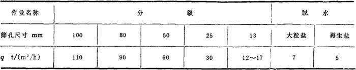 图4-3-40 振动筛脱水示意图 1-筛上喷水管 2-筛下泄水管 振动筛以一定的频率、振幅和抛射强度,使原盐脱水、分级,上层筛上的大粒原盐经溜槽进入成品盐刮板输送机,下层筛上的粉盐经溜槽进入原料盐刮板输送机,水分和泥砂经筛下泄水管集中排出。 目前湖盐筛分、脱水,一般采用单轴和双轴惯性振动筛;安装形式有吊式和座式两种。这种筛子具有重量小、适用范围广、处理能力大和筛分效率高等优点。 为了克服旋流器底流盐浆对筛面的冲击,可把对着底流口处的筛板改为实板。根据筛分、脱水盐种和工艺要求,分别采用冲孔筛板、编织筛网或条缝筛板。冲孔筛板的主要优点是使用寿命长,用于25mm以上的分级,效果很好,多用在上层;缺点是有效面积小,一般仅为40%左右,重量大,通常用橡胶材料制作。编织筛网的主要优点是有效面积大,一般可达70%,在振动过程中会产生二次振动,有利于分级脱水。条缝筛板的有效面积仅15%,但筛隙小,不易堵塞,对原盐脱水有利,多用于下层筛。常用振动筛参数及生产能力见表4-3-6、4-3-7、4-3-8。 表4-3-6 单轴振动筛基本参数