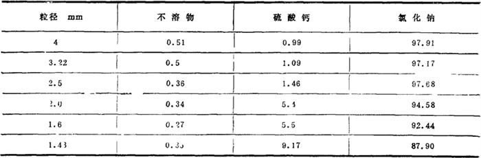 2.原盐脱水、分级 (1)原盐粒度大,级配较稳定,卤水粘度小,用振动筛脱水效果很好。其出料水分可稳定在5~7%,便于和皮带机、离心机衔接。 (2)上层筛孔径的确定 湖盐固相矿床随着粒径的增大,氯化钠含量提高,泥砂、硫酸钙等杂质明显下降。通过产区勘探,作出石盐粒度筛分和化学分析结果,见表4-3-9。 表4-3-9 不同粒径原盐化学成分表 (%)
