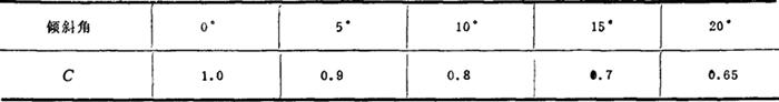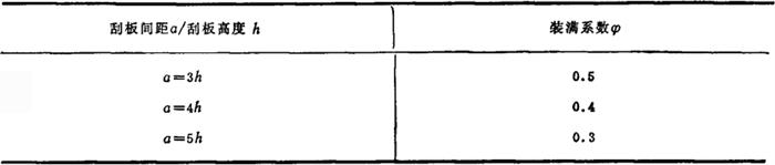 图4-3-43 刮板输盐机 2.刮板输送机的安装 可作水平安装或倾斜安装。倾斜安装时还可作洗盐分级之用。倾角一般应不大于20°;在个别情况下,输送量无严格要求时,最大倾角可达50°。与皮带运输相比,其缺点是输送阻力大,消耗功率高;优点是输送能力大,运行稳定,不受所运物料块度和湿度的限制。 3.刮板输送机的选型计算 (1)生产力计算 Q=3600F·V·φ·γ·C (4-3-38) 式中 Q——输送量(t/h) F——装载净断面(m2),见表4-3-10 表4-3-10 装载净断面F值