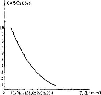 根据表4-3-11,绘制筛分孔径与筛出率关系曲线图(图4-3-41)和孔径同硫酸钙含量关系曲线图(图4-3-42)。 表4-3-11 装满系数φ值