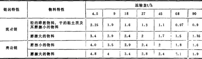 V——链速(m/s)取V=0.46~0.8 φ——装满系数,见表4-3-11 γ——散盐容重(t/m3) C——倾角系数,输送机倾角α=0°时,C=1;α=10°时,C=0.85;α=20°时,C=0.65。其他角度的C值可按插值法求得 (2)功率计算 在实际应用中可按下式计算 或 N= 式中 Q——输送量(t/h) L——运输机长度(m) H——倾斜运输中原盐提升高度(m) K——总阻力系数,见表4-3-12 表4-3-12 阻力系数