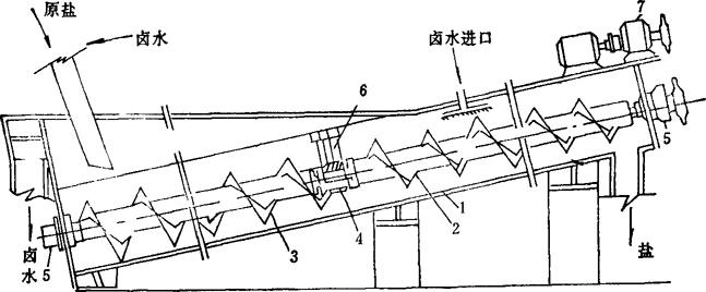 η——传动效率,0.65~0.85 (四)螺旋分级机洗盐 1.结构及使用方法 螺旋分级机是矿山浮选设备之一(图4-3-44)。由机槽1、螺旋2、3、联轴节4止推轴承5、吊架6、传动装置7、进料口、卤水喷头、溢流槽等部分组成。
