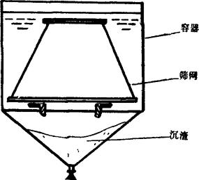 图4-3-45 筛网除垢装置示意图 反应过程中产生的固体氢氧化钙以及石膏、泥砂微粒等沉积在容器底部;如果沉渣太多,妨碍筛网下部浸泡,可打开底部阀门排走,然后补充碱液。此法除垢有以下优点: ①处理方法经济、简单、省事; ②除垢干净,效果好,筛网不变形,非一般机械或物理方法所能及; ③碱液对筛网和容器的腐蚀轻微(筛网为不锈钢制,容器为钢制)。 |