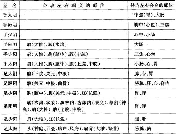 | 释义 | 左右的联系 经络左右两侧的联系可以从经络的分布和交会关系来理解。左右两侧的经脉,除了在体表任督两脉(正中线上)交会之外,还在体内通过“属”、“络”有关的脏腑而沟通左右两侧的脉气。十二经脉在体表和体内左右交接或会合的部位列入表2-57中。 表2-57 十二经脉左右联系相交部位表