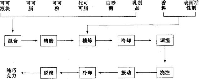 | 释义 | 巧克力加工装备 1 概述 巧克力又称“朱古力”。它是以可可料、可可脂为基本组成的一类特殊食品,它具有特殊的色、香、味和特殊的组织结构,并具有高热值和高营养价值的特点。当今巧克力制品已发展成为糖果中的一个独立体系,随着花色巧克力的不断增多,越来越受到人们的青睐。巧克力糖加工装备即是将砂糖粉、可可料、可可脂、乳粉、香料等物料按一定工艺要求加工成巧克力糖的多种机械和设备。 2 加工工艺 图1-11-20所示为纯巧克力糖加工工艺流程。首先将符合要求的各种原料,例如糖粉、可可粉、可可脂及乳粉等按要求比例加入后进行充分混合。然后进行精磨至巧克力质构要求的细度。