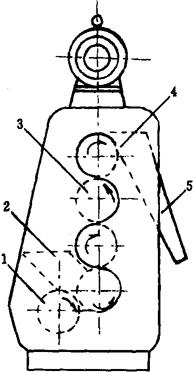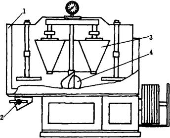 图1-11-21 五辊精磨机 1-辊筒 2-进料处 3-电动机 4-刮料刀 5-出料口 5个辊筒的转速不同,进料辊筒转速最慢,出料辊筒转速最快,辊筒与辊筒之间始终有固定的间隙,此间隙通过液压系统自动调节。同时通过自动控温系统,使各个辊筒都保持各自指定的工作温度,从而保证物料能保持应有的温度和粘度。 五辊精磨机与圆筒形精磨机相比,五辊精磨机生产率高(300~500kg/h);精磨后的巧克力浆料的细度较均匀。粗细度可调节;在与精练机相配套后,成品的质量明显优于用圆筒形精磨机生产的巧克力;在相同生产能力下,具有占地面积小、耗能低的特点。 该机缺点是设备结构较复杂,辊筒磨损后的修复较为困难。 3.1.3 三辊精磨机 三辊精磨机是与五辊精磨机相类似的一种精磨机。它由3个辊筒组成。辊筒有的成一水平状,有的倾斜为斜线,后者占地较小。一般三辊精磨机精磨巧克力料约25kg/h。工作效率比五辊精磨机低。 3.2 精炼机 精炼机是为了提高巧克力品质,制成细腻润滑、低粘度的巧克力糖。物料经24~72h的反复翻动、推撞、摩擦,而被进一步磨平、磨细到精炼成制品。因此,在现代化的巧克力工业中,精炼过程是一个不可缺少的加工步骤,尤其质量等级水平高的巧克力。 精炼机的型式很多,但所起的作用基本相似,唯一不同的方面在于最后物料所达到的香味效果。回转式精炼机是巧克力生产中一种常用的精炼机。其结构如图1-11-22所示。