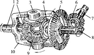 | 释义 | 差速器与差速锁 (一)差速器 差速器将中央传动大圆锥齿轮的动力传给左右半轴齿轮,并使两侧驱动轮在转向时差速转动。轮式拖拉机广泛采用的圆锥齿轮式差速器如图4-29所示。它由差速器壳、两个行星齿轮和2个半轴齿轮等组成。中央传动大圆锥齿轮固定在差速器壳体一侧,壳体中部固装2根行星齿轮轴,行星齿轮空套在轴上,2个半轴齿轮与行星齿轮相啮合,并与左、右半轴花键连接。中央传动大圆锥齿轮带动差速器壳体转动时,动力经行星齿轮轴和行星齿轮平均分配给两边的半轴齿轮和半轴,并驱动两侧的驱动轮旋转。泰山-25、上海-50等型拖拉机差速器的行星齿轮和半轴齿轮安装在封闭的壳体内,称为闭式差速器。铁牛-55、650型拖拉机的差速器壳体不封闭,称为开式差速器。