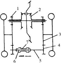 图4-30 铁牛-55、650型拖拉机差速锁示意图 1.最终传动主动齿轮 2.半轴齿轮 3.最终传动从动齿轮 4.右附加齿轮 5.右制动轴 6.浮轴 7.啮合套