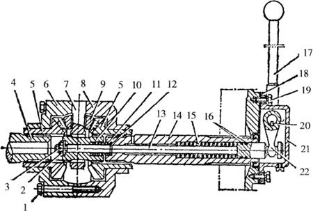 图4-31 上海-50型拖拉机的差速锁 1.螺栓 2.槽形螺母 3.开口销 4.左短半轴 5.半轴齿轮 6.差速器左壳 7.十字轴 8.差速器右壳 9.行星齿轮 10.连接齿套 11.缓冲弹簧 12.钢丝挡圈 13.推杆 14.右短半轴 15.回位弹簧 16.密封圈 17.差速锁操纵手柄 18.垫片 19.螺栓 20.键 21.盖 22.拨叉 |