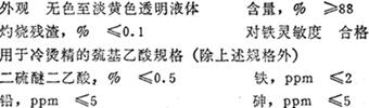 | 释义 | 巯基乙酸 别名 硫代乙醇酸、氢硫基乙酸、硫醇代乙酸 结构式 HS-CH2-COOH 分子量92.12 性能 微黄色或几乎无色的透明液体,有强烈令人不愉快的气味。在空气中迅速氧化,少量铜、铁、锰离子的存在能加速氧化。熔点-16.5℃,沸点123℃(29mmHg),108℃(15mmHg),96℃(5mmHg)。相对密度1.3253(20°/4℃),折光率1.5030。能与水、醇、醚、氯仿、苯混溶。浓度小于70%(重量)的水溶液,在室温下贮存是稳定的,而在高浓度时,则会生成一定量的自酯化物。毒性:LD500.15mL/kg(大鼠,经口)。 质量规格(参考)