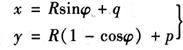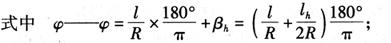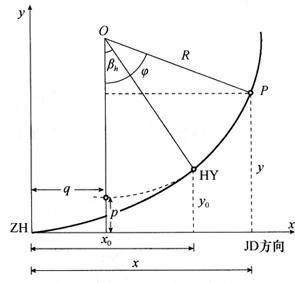 式中 li——缓和曲线上任一点i至曲线起点或终点的曲线长。 对于圆曲线段部分,各点的直角坐标仍和以前计算方法一样,但坐标原点已移至缓和曲线起点,因此原坐标必须相应地加q、p值,即