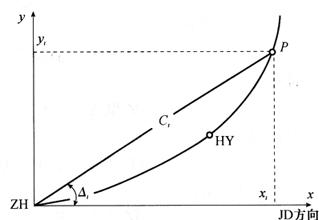 l——圆曲线上任一点至HY点或YH点的曲线长; lh——缓和曲线长。 实际工作中,缓和曲线和圆曲线各点的坐标值也可由曲线表查出,曲线的设置方法和圆曲线的切线支距法测设方法完全相同。 2.偏角法(极坐标法) 偏角法的测设方法实际是一种极坐标法,它利用一个偏角△和一段距离C来确定曲线上某点,如图11-12所示。和切线支距法一样,以缓和曲线的起点ZH或终点HZ为坐标原点,以过原点的切线为x轴,过原点且垂直于x轴的方向为y轴。曲线上某点P至曲线的起点(ZH点或HZ点)的距离为Ci,P点和原点的连线与坐标轴的x轴之间的夹角为△i。它们可以通过切线支距法求出的点的坐标P(xi、yi)来进行计算。