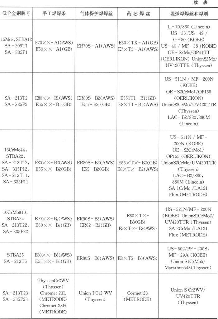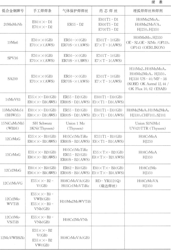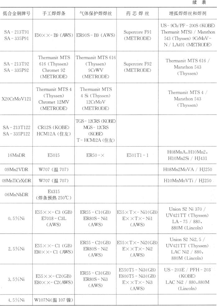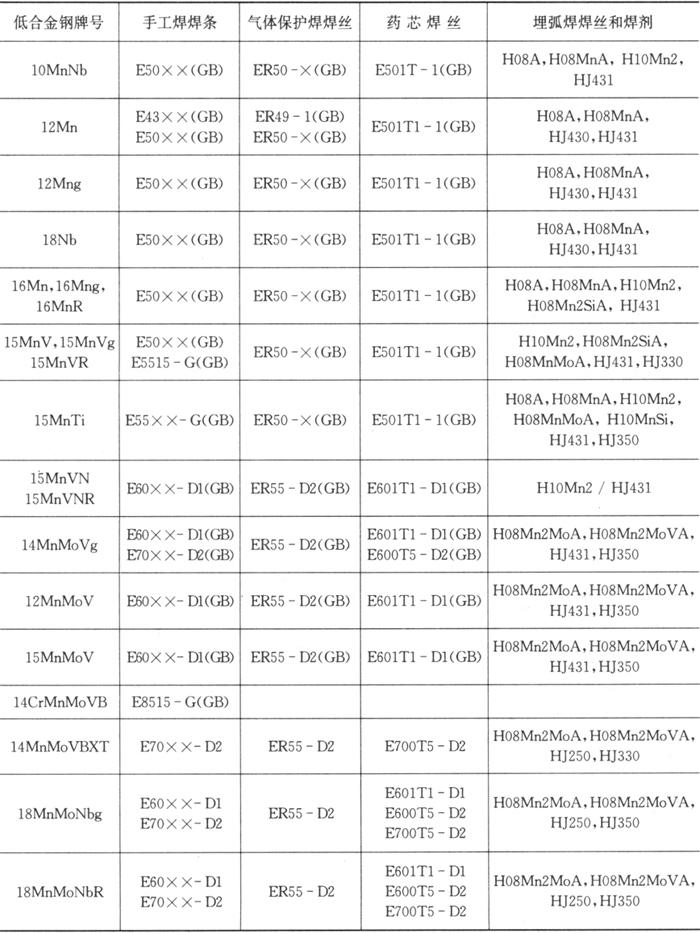 表2.6-1 常用低合金钢焊接材料选用一览表