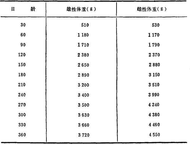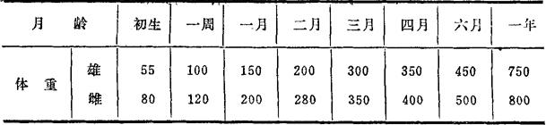 三、家兔 家兔的寿命为4~9年。第一次配种期为7~9个月,孕期30天。哺乳期30~50天。一年内可产仔3~5胎,每胎产仔1~5只,交配期1~5天。雌兔生育期4~5年,雄兔生育期2~3年。雄兔到3个月左右必须与雌兔分开单独饲养。过肥的雄兔应减少精料,增加青料和多汁饲料。雌兔在怀孕15天后,应适当增加蛋白质饲料和喂给一定量的骨粉或蛋壳粉。怀孕后期应减少青粗料的喂量。 家兔耐寒不耐热。兔笼应保持干燥,饲于铁丝笼内,下有底盘盛粪便,底盘每日清洁一次。繁殖母兔的笼后应附有兔窝。 家兔是单胃草食动物。饲养以青饲料为主,配以适量的精饲料,精饲料每天每只兔约70g,分二次喂给。并给予充足的饮水。青饲料需洗净晾干表面水分后喂给。刚收获的红薯含有大量的氯化酶,如喂量过多,会发生胃肠臌胀。怀孕母兔的饲料应增加钙、磷的含量。在饲料中拌入1~2%的灰质(木炭末、糠末或稻草灰等),可以抑制饲料在胃肠中过度发酵和吸收肠中的水分、气体、以防止拉稀。 家兔精料配方如下。 1.麸皮240、豆饼100、高粱80、玉米面160、骨粉8、酵母粉4、食盐4,合计596(饲喂时按喂料量加入1%鱼肝油)。 2.麸皮20%、燕麦30%、豆饼10%、玉米皮10%、豆皮10%、黑豆20%。此外根据需要可另加鱼粉3%、食盐1%。 家兔品种甚多,其中以大耳白兔(又名日本大白兔)对病原微生物较易感,且耳大便于静脉注射,为实验用的理想品种。 表3-3 大耳白兔的日龄与体重的关系