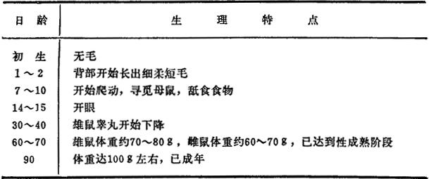 图3-1 养鼠罐 小白鼠和金黄地鼠的混合精饲料配方和料块制法如下。 麸皮100、豆饼250、高粱110、面粉250、玉米面189、鱼粉50、骨粉25、食盐10、酵母粉16、鱼肝油按1%,以上总计1000。混合料粉制成面团,切块,烘干,存干燥通风处。料块最好每周制作一次,冬季可保存一个月。北方保存时间较长。 表3-1 小白鼠的日龄与体重的关系