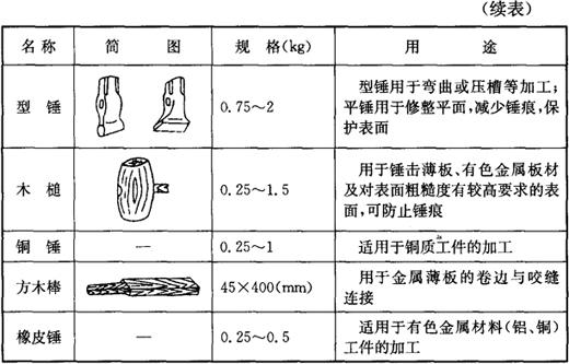 | 释义 | 常用工具 钣金制作中常用的工具按其功能分为锤类工具、划线工具、风动工具、电动工具和起重工具等若干大类。 锤类工具分为钣金锤、钳工锤和大锤等几种。其规格和用途见表5-2。 表5-2 锤类工具