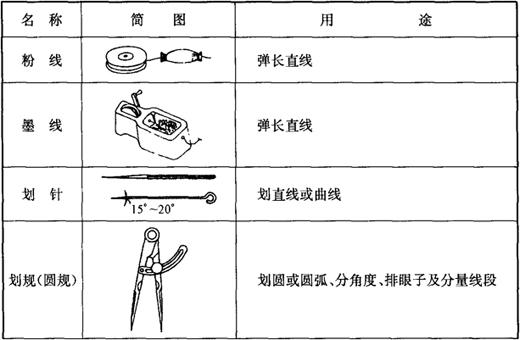 划线工具包括划针、划规、样冲、划针盘及弓形夹头等,详见表5-3。 表5-3 划线工具