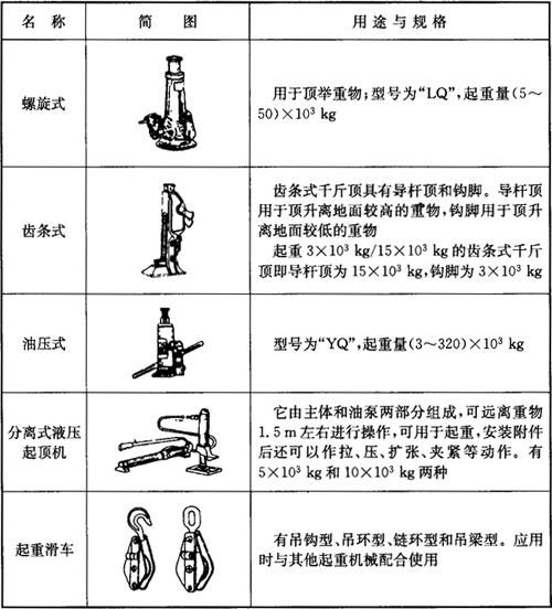 起重工具是指起吊或提升重物时所用的工具,常见的起重工具有千斤顶与起重滑轮(表5-6)、起重绳索(表5-7)和吊具(表5-8)等。 表5-6 千斤顶与起重滑车