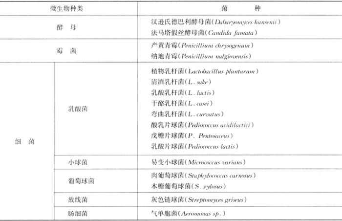 | 释义 | 常用微生物种类 在发酵香肠生产中,常用的发酵剂微生物种类有酵母菌、霉菌和细菌(表2-9-5),它们在发酵香肠加工中的作用各不相同。 表2-9-5 发酵香肠发酵剂中常用的微生物种类