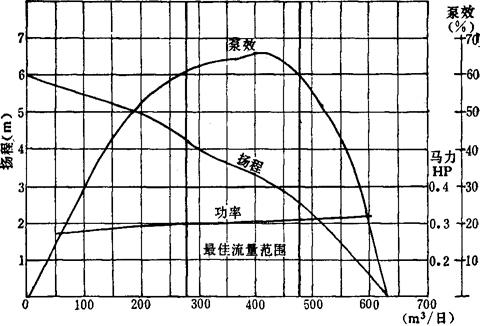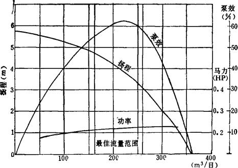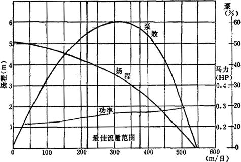 图3-3-110 95系列A42型沉没泵单级特性曲线 注:转速2820r/min,相对密度1 (二)常用沉没泵性能曲线 1.天津市电机厂沉没泵性能曲线,见图3-3-120~123。