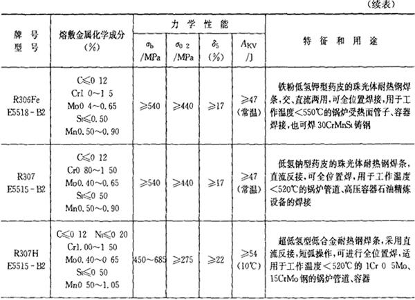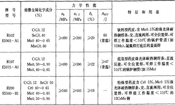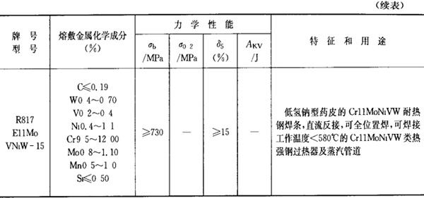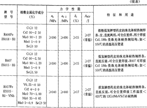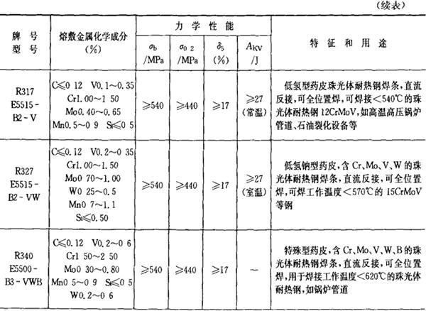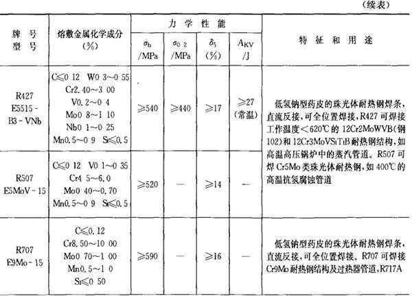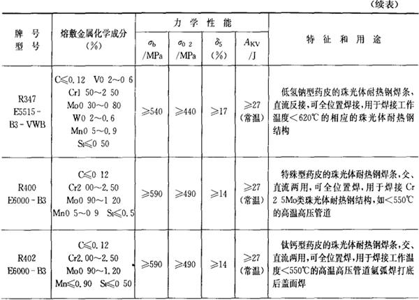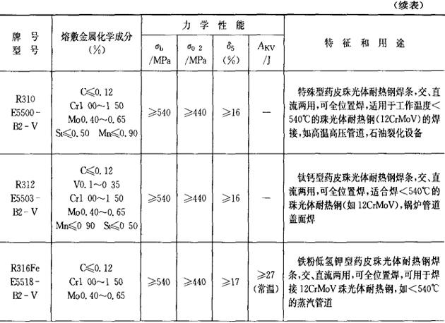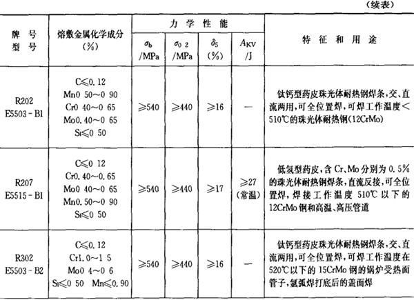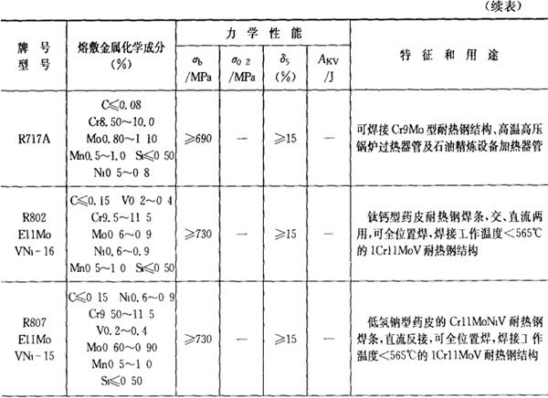 注:焊条化学成分中硫(S)、磷(P)的常规含量:高效结构钢焊条、碳钢焊条S≤0.035%,P≤0.040%,低合金钢焊条:S≤0.035%,P≤0.035%,若有特殊要求,按技术条件。 2.铬和铬钼耐热钢焊条 铬和铬钼耐热钢焊条的成分、性能和用途列于表2.1-22。 表2.1-22 铬和铬钼耐热钢焊条的成分、性能和用途