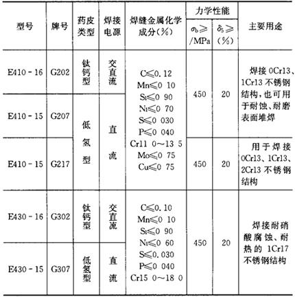 注:1.上表中耐热钢焊条,含硫(S)一般为≤0.035%,含磷(P)一般≤0.035%,R517A、R717A:S≤0015%,P≤0.020%。 2.焊前焊件预热温度:R102、R106Fe、R107、R207,90~110℃,R200、R202、R400、R420、R406Fe,160~200℃,R427、R507、R707、R717A、R347,300~400℃;R302、R306Fe、R307,150~250℃,R802、R807、R817,350~400℃;R310、R312、R316Fe、R317、R327、R337、R340、R407、R417Fe,250~300℃。 3.不锈钢焊条 (1)铬不锈钢焊条 铬不锈钢焊条的成分、性能和用途列于表2.1-23。 表2.1-23 铬不锈钢焊条的成分、性能和用途