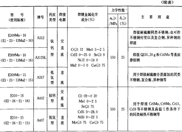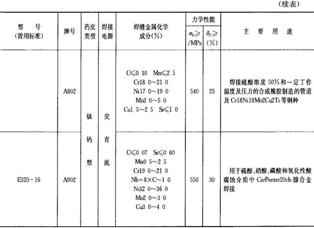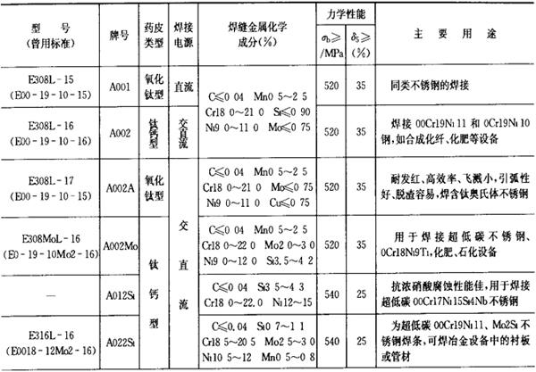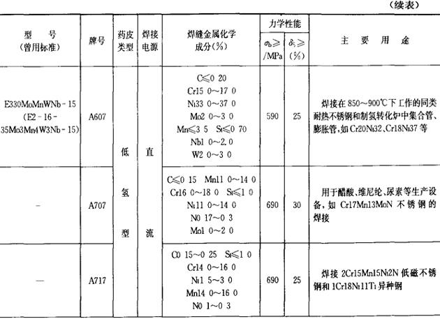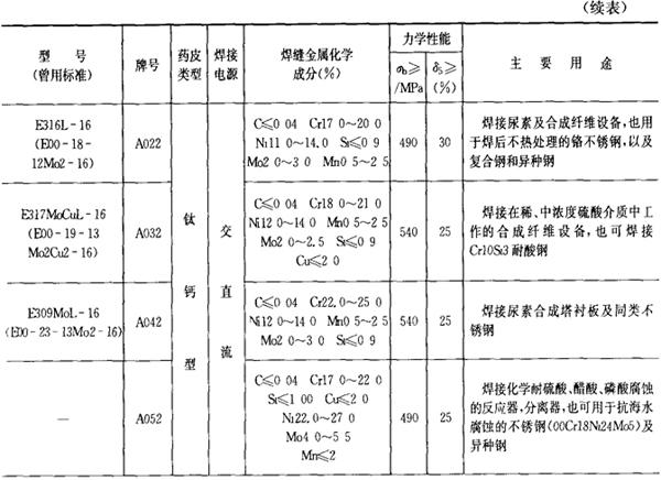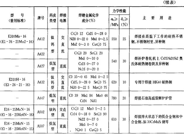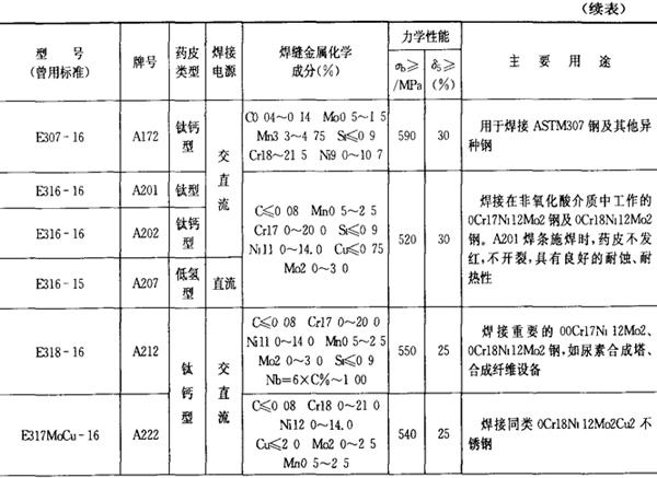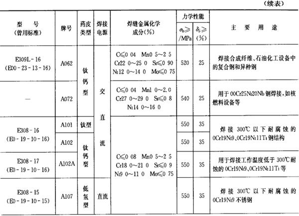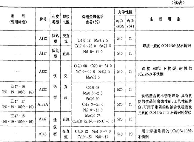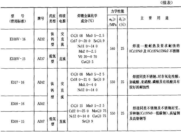 (2)铬镍不锈钢焊条 铬镍不锈钢焊条的成分、性能和用途列于表2.1-24。 表2.1-24 铬镍不锈钢焊条的成分、性能和用途
