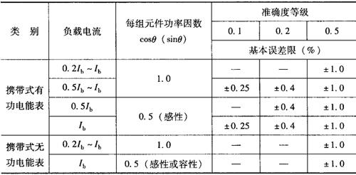 注:周期检定时允许将cosφ=0.8和sinφ=0.8,改成cosφ=0.866和sinφ=0.866。对0.1级携带式有功电能表,括号内误差仅供参考。 表7-7 不平衡负载时携带式三相有功和无功电能表的基本误差限