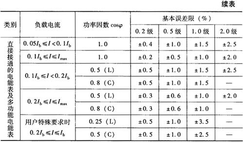 注:①不平衡负载是指在对称的三相电压下,电能表任一电流线路有电流,其余电流线路无电流; ②功率因数角θ是指加在有电流那一组元件上的电流与电压间的相位差。 ②在检定周期内,电能表的基本误差值不得超过表7-13至表7-14的规定。标准电能表在检定周期内基本误差改变量的绝对值不得超过基本误差限的绝对值。 表7-13 单相和三相(平衡负载)安装式电能表的基本误差限