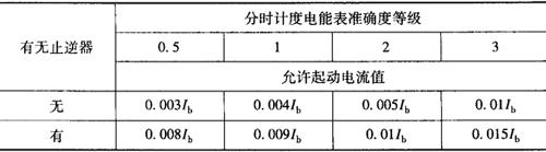 注①Ib-标定电流;Imax-额定最大电流 ②周期检定时允许将cosφ=0.8改成cosφ=0.866,但其基本误差限仍不改变; 角φ是指相电压与相电流间的相位差。 ③适用于使用中的分时计度无功电能表。 (3)潜动:当电流线路无负载电流而电压线路加80%~110%对称三相额定电压时,电能表转盘转动不得超过1转。 (4)起动:在额定电压、额定频率和cosφ=1.0(对有功电能表)或sinφ=1.0(对无功电能表)的条件下,负载电流不超过表7-17规定时,电能表转盘应连续转动。 表7-17 分时计度电能表的起动电流