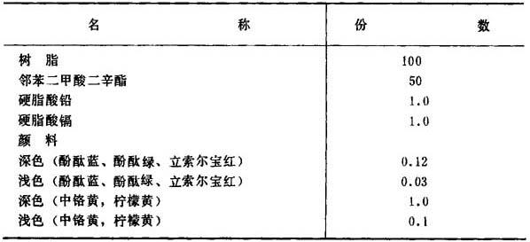式中 X——水溶性盐的百分含量 G1——样品重 G2——蒸发皿中所增加之重量 ④耐热性 a.测定步骤 取100g捏和料在温度为150~160℃的条件下辊压10~15min,辊压成25×125×0.4mm的薄片。 平放在清洁钢片上置于有空气流动的烘箱内,在180±1℃加热10min或17±1℃加热30min。 与未经加热的色片比较。 b.评级 耐热性分5级。1级最劣,5级最好。将热处理后的试样冷却后,与原料一起参考国家标准GB250-64作染色牢度和退色评定。 捏和配方