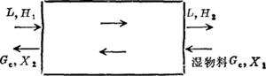 图16-8 连续干燥器的物料计算 GcX1+LH1=GCX2+LH2 式中 GC——绝干物料的质量流量(kg/s); L——绝干空气的流量(kg/s); H1,H2——分别为空气进、出干燥器时湿度(kg水/kg绝干气); X1,X2——分别为湿物料进、出干燥器时的干基含水量(kg水/kg绝干料)。 或 W=Gc(X1-X2)=L(H2-H1) 式中 l——单位空气消耗量(kg绝干气/kg水); W——水分蒸发量(kg水/s)。 2.热量衡算(图16-9)
