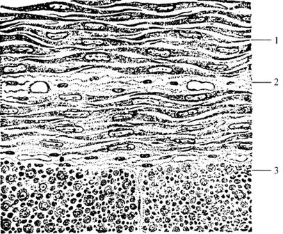 图1-2-11 平滑肌 1-平滑肌纤维的纵切面 2-结缔组织 3-平滑肌纤维的横切面 平滑肌纤维以单一或成束两种形式存在,但其排列组成均十分细致,网状纤维框架结构将平滑肌纤维固定在一定位置。单离的肌原纤维或弹性纤维的肌原微丝分散于纤维间的基质中。平滑肌血液供应比骨骼肌差。平滑肌收缩有节律且缓慢而持久。 |