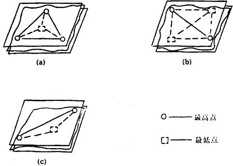 | 释义 | 平面度测量 1.平面度误差的评定准则 按最小包容区域评定平面度误差时,要求至少有三点或四点相接触,并符合三种准则之一: 第一、三角准则。出现三个最高点与一个最低点,而低点位于三个最高点连成的三角形区域内,或者相反。如图3.3-15(a)。