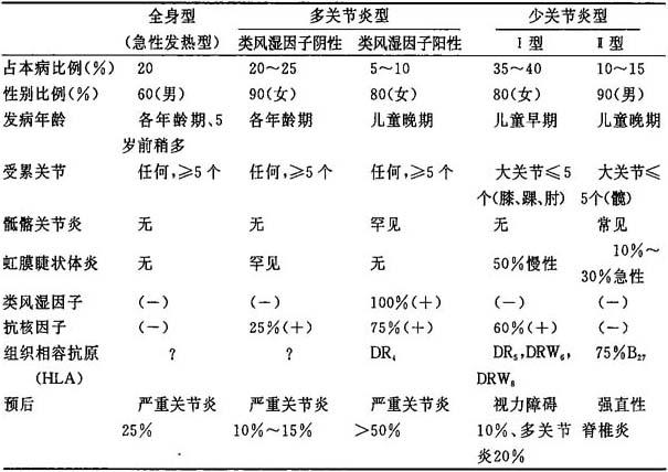| 释义 | 幼年型类风湿关节炎 【释义】: 又称幼年型类风湿病,小儿时期常见,以慢性关节炎为主要特点,伴全身多系统受累。年幼儿常全身症状突出,年长儿则较多限于关节炎症状。 【诊断】: 1.临床表现 (1)发热 呈弛张型,可伴寒战,持续数周或数月后可自行缓解,但易复发。 (2)皮疹 常为圆型充血性斑丘疹,可融合成片,分布于胸部及四肢近端,随体温的升降而时现时隐。 (3)关节症状 单个或多个关节肿痛,大小关节均可受累。发病6个月后可有关节僵直变形。 (4)肝、脾及全身淋巴结肿大。 (5)部分患儿可出现胸膜炎、心包炎、虹膜睫状体炎等。 2.辅助检查 (1)实验室检查 1)贫血 白细胞增多(>20×109/L),血小板增多。 2)血沉 增快。 3)C反应蛋白 阳性。 4)多关节炎型 年龄较大的女孩中,类风湿因子多为阳性。 5)抗核抗体 可阳性。 6)血清 IgA,IgG,IgM增高。 (2)影像学检查 骨、关节X线摄片,早期可见关节腔增宽,周围软组织肿胀,后期有关节面骨质破坏。 3.类风湿分型 幼年类风湿性关节炎,详见表10-3。 表10-3 幼年类风湿关节各型临床特点