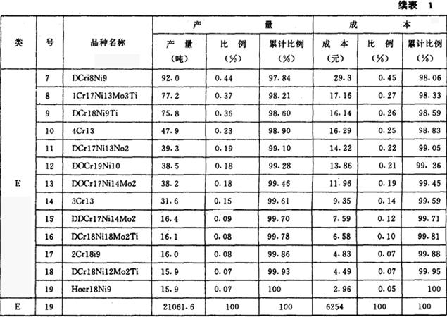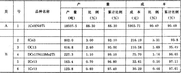 | 释义 | 应用价值工程降低不锈钢生产成本 价值工程不仅适用于机械等行业,也适用于冶金企业。某炼钢厂生产的不锈钢成本高,与同类厂相比每吨钢成本高出百分之二十。该厂应用价值工程,选择1Cr18Ni9Ti不锈钢作为对象,运用技术、经济和管理等方法综合分析,降低了成本,取得显着效果。 一、选择价值工程的对象 选择1Cr18Ni9Ti作为工作对象的依据: 1.用ABC法确定VE对象 该厂冶炼不锈钢,共有十九个品种。根据收集的资料,列表如表1。 表1 某厂不锈钢产量、成本比重表