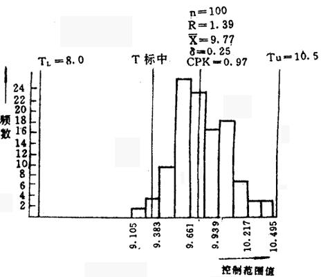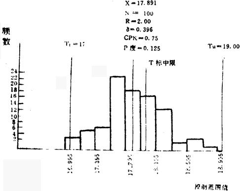 由上表知:Cr的价值系数Vi=0.738<1,Ni的价值系数Vi=0.528<1,可见Cr与Ni两种元素价值不高,故确定为重点降低成本对象。 三、提出改进方案 经功能分析,Ni、Cr是降低1Cr18Ni9Ti成本的主要因素。集中群众意见,确定采用下限冶炼法,控制Ni、Cr成份,保持基本功能不变,降低成本。 1.通过调查,随机抽取100炉冶炼数据,用变换组中值方法,计算出有关参数(略),并作出直方图。见图4、图5。