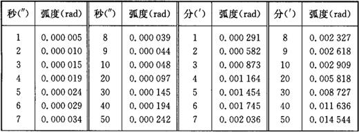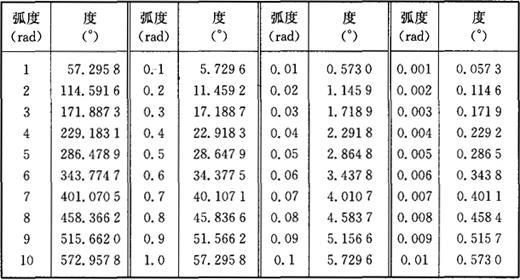 | 释义 | 度与弧度对照、弧度与度对照及分、秒与小数度对照 1.度、分、秒与弧度对照 度、分、秒与弧度对照见表1-18。 表1-18 度、分、秒与弧度对照表