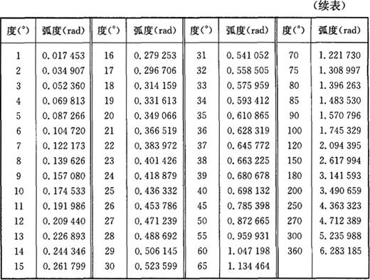 2.弧度与度对照 弧度与度对照见表1-19。 表1-19 弧度与度对照表