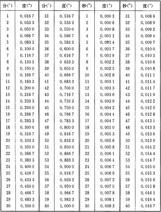 3.分、秒与小数度对照 分、秒与小数度对照见表1-20。 表1-20 分、秒与小数度对照表