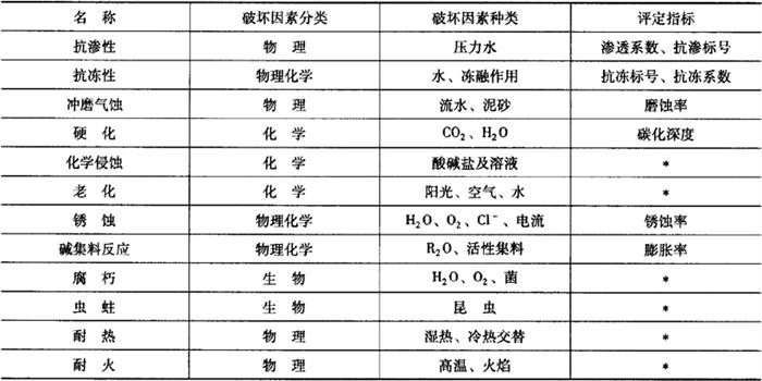 | 释义 | 建筑材料的耐久性能 材料在长期使用过程中,能抵抗周围各种介质的侵蚀而不破坏,并能保持原有性能的性质,称为建筑材料的耐久性能,这是确保建筑工程强度、稳定性、使用功能和使用年限的重要性质。 建筑材料在使用过程中,除受到各种外力的作用外,还经常受到周围环境中各种因素的破坏作用,这些破坏作用包括物理作用、化学作用、生物作用等。物理作用包括温度、湿度的变化及冻融循环等,物理作用主要使材料体积发生胀缩,长期或反复作用会使材料逐渐破坏;化学作用包括各种液体和气体与材料发生化学反应,使材料逐渐变质而破坏;生物作用是指在虫害和菌类的作用下,使材料发生虫蛀、腐朽而破坏。 材料遭到破坏往往是多种因素同时作用引起的,很少是某一个孤立的因素造成的;另一方面,由于各种材料的化学组成和组织结构差异很大,因此各种破坏因素对不同材料的破坏作用是不同的。金属材料主要受化学作用的腐蚀;无机非金属材料(如砖、石材、混凝土等)主要受大气的物理作用而破坏;木材、竹材等植物纤维组成的材料,常因虫、菌的蛀蚀而腐朽破坏;沥青、高分子材料在阳光、空气及热的作用下,会加快老化的速度而变得硬脆、破坏。 由以上所述可见,建筑材料的耐久性是一项综合性质,包括强度、抗冻性、抗渗性、耐磨性、大气稳定性、耐化学侵蚀性等。因此,无法用一个统一的指标去衡量所有的耐久性,应根据材料的种类和建筑物所处的环境条件提出不同耐久性的要求,如结构材料要求具有较高的强度;处于冻融环境的工程,要求材料具有良好的抗冻性;水工建筑物所用的材料要求有良好的抗渗性和耐化学腐蚀性。 在实际建筑工程中,由于各种原因,建筑材料常会因耐久性不足而过早破坏,因此,耐久性是建筑材料的一项重要技术性质。只有了解和掌握建筑材料的耐久性,从材料、设计、施工、储存、使用各方面共同努力,才能保证材料和结构的耐久性,延长建筑物的使用寿命。 材料耐久性及破坏因素的关系见表2-6。 表2-6 材料耐久性及破坏因素的关系